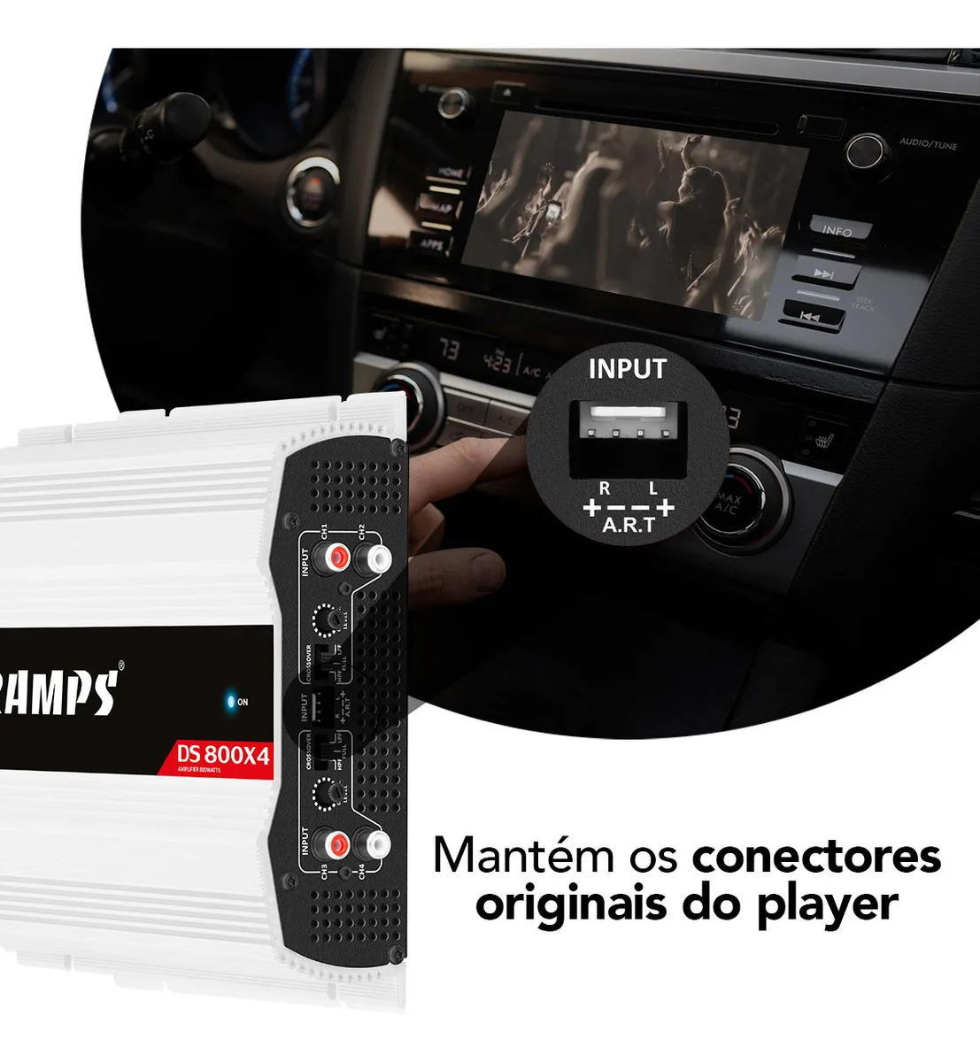 • Potência @12,6v – 2 ohms, estéreo: 4 x 200 watts rms. A potência com tensão de 12,6v volts, está relacionada ao funcionamento do veículo/fonte de alimentação.