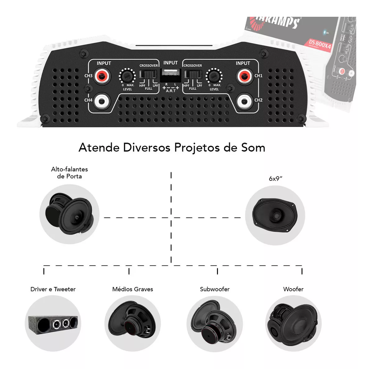 Devido à sua diversidade, pode ser instalado para amplificar alto-falantes de portas e tampão de carros, caminhonetes, picapes, SUVs, caixas de moto propaganda, kit 2 vias, kit 4 vias, coaxial, triaxial, quadriaxial, 4 polegadas, 5 polegadas, 6 polegadas, 6x9 polegadas, 5x7 polegadas, caixa trio, caixas bob, caixas residenciais, entre outros.